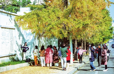 周末,大学生小李和同学们专程从南湖学校坐地铁赶来观赏。“朋友圈都被这里的照片刷屏了,听说银杏和起义门同框特别美,所以来看看。”他们镜头下的画面中,金黄的落叶与起义门的青砖黛瓦相映成趣,勾勒出一幅生动的古城秋景图。