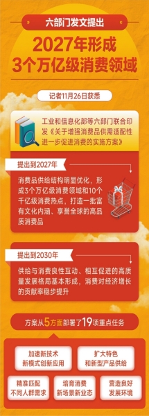 记者11月26日获悉,近日工业和信息化部、国家发展改革委、商务部等六部门联合发布《关于增强消费品供需适配性进一步促进消费的实施方案》(以下简称《方案》),提出到2027年,消费品供给结构明显优化,形成3个万亿级消费领域和10个千亿级消费热点,打造一批富有文化内涵、享誉全球的高品质消费品;到2030年,供给与消费良性互动、相互促进的高质量发展格局基本形成,消费对经济增长的贡献率稳步提升。