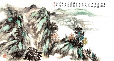 款识:碧绣云烟景,山居泉水流。欣颜沾露色,客兴逐莺游。江汉区民权街道世彩社区