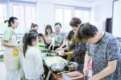 五环社区将“幸福食堂”打造为银龄服务的主阵地,每月定期开展“五福食光里”主题系列活动。在美食制作环节,邀请辖区老年烹饪爱好者展示拿手菜,从“月色清雅”的清蒸鱼到“蒜蓉开边虾”的鲜爽,从鲜肉包的松软到酸菜鱼的酸辣,老人们一边切磋厨艺,一边交流生活心得。特别是在传统节日期间,食堂更成为情感交流的重要场所:冬至时节,大家围坐在一起包饺子、话家常,用热气腾腾的团圆味驱散冬日的寒意;端午节期间,组织开展“粽叶飘香邻里情”活动,老人们手把手教年轻人包粽子,在传承技艺中增进代际情感。