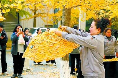 上周,杭州的张小姐在北京逛公园时,也偶遇了有人戴着落叶帽,“在太阳映照下,银杏叶非常亮眼,戴在头上拍照很出片”。