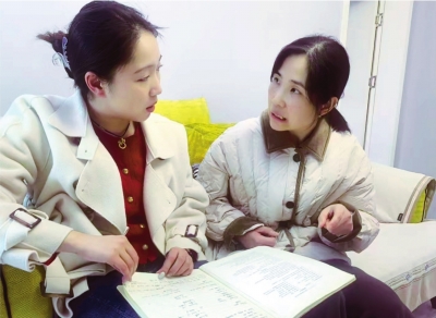 | 英语老师朱琬莹(左)和学生彭雨泽的妈妈交流学习情况。 |