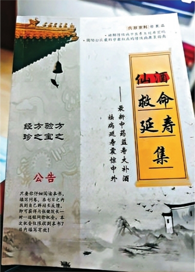 说是说明书,王女士一看书名《仙酒救命延寿集》,差点气晕过去。再看书里的内容,有一章叫“真实见证:××大补酒让中老年甩掉一身病”,其中不乏“20年的冠心病奇迹般逆转”“原来拄拐不能走,今朝小跑十里行”“××大补酒救了我的命”等离谱案例。