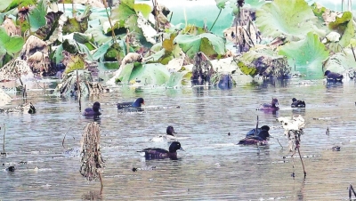 | 12月4日,一个青头潜鸭小族群在东湖水域出没。 通讯员高然 摄 |