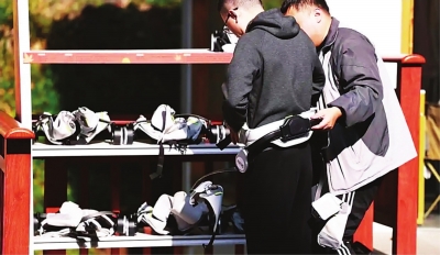 | 工作人员正在帮助游客穿戴登山助力外骨骼设备。 (受访者供图) |
