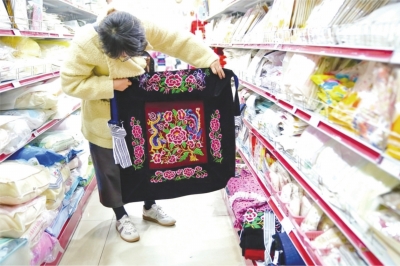 | 12月2日,一名年轻顾客在长春百货商店挑选背孩子的老式绣花背被。 中新社发 |