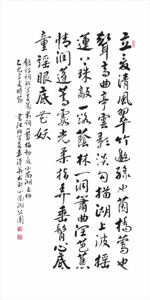 释文:立夏清风翠竹邀,绿也茵桥,莺也声高。曲亭云影淡勾描,湖上波摇,莲下珠敲,一路荫林一洞箫。曲润芭蕉,情润蓬蒿,霞光柔指弄垂髯,心底童谣,眼底花妖。
