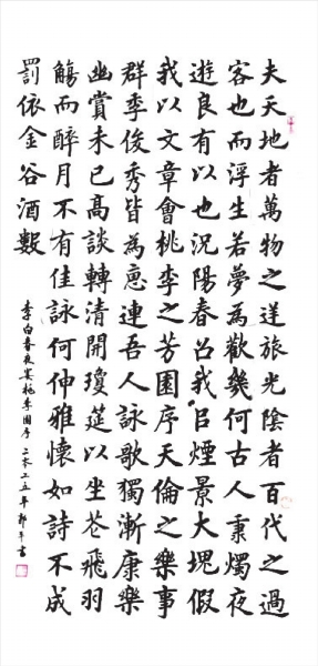 | 《春夜宴桃李园序》 文字内容:夫天地者,万物之逆旅;光阴者,百代之过客也。而浮生若梦,为欢几何?古人秉烛夜游,良有以也。况阳春召我以烟景,大块假我以文章。会桃花之芳园,序天伦之乐事。群季俊秀,皆为惠连;吾人咏歌,独惭康乐。幽赏未已,高谈转清。开琼筵以坐花,飞羽觞而醉月。不有佳咏,何伸雅怀?如诗不成,罚依金谷酒数。 作者:郭平(54岁) 东湖高新区佛祖岭街道牌楼社区 |