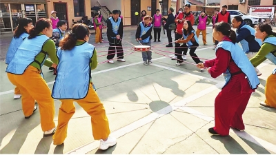 | 社区居民齐心协力参加运动会同心鼓项目。 |