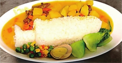 宝剑盖饭以越王勾践剑为创意原型,凭借鲜明的辨识度“圈粉”游客。只见工作人员将蒸至软糯的米饭盛入定制模具中,轻轻压实,静置定型后,缓慢脱模,一把线条流畅的“米饭宝剑”初具雏形。随后,根据食客点选口味,将咖喱鸡肉、鱼香肉丝等,均匀浇在“剑身”两侧。