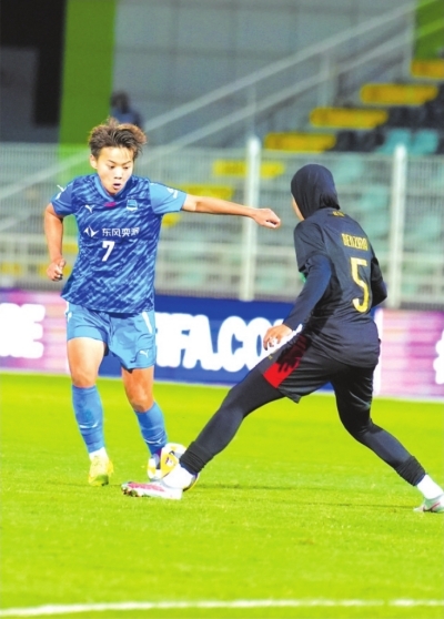 | 王霜(左)在比赛中带球突破。 新华社发 |