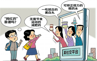 无需节食运动的减肥药、一吃就白的美白丸、可矫正视力的眼药水……近年来,不少“网红药”风靡市场。直播间内的“限时抢购”、社交平台上的“种草攻略”、朋友圈里的“熟人背书”,吸引网民跟风购买。