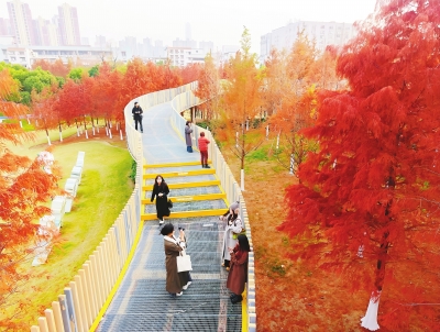 冬日里的常青人才公园,百亩杉林如火焰般燃烧,将整个公园染成一片醉人的红。