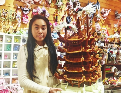 | 闫佳端着半人高的黄鹤楼模型。 |