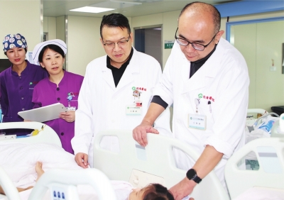 | 王小林(右二)和余东海(右一)检查笑笑术后情况。 医院供图 |