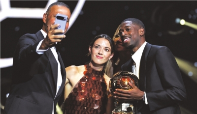 | 登贝莱(右)、邦马蒂(中)在颁奖典礼上与主持人自拍合影。 新华社发 |