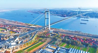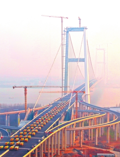 “大桥选用一跨过江悬索桥方案。”全国工程设计大师、大桥总设计师徐恭义介绍,主桥桥墩和锚碇均设在两岸无水区,1430米主跨一跨过江。南北引桥和两岸立交接线也充分考虑防洪环保要求,为避让北岸涨渡湖湿地自然保护区,桥位线路专程绕道近1公里。