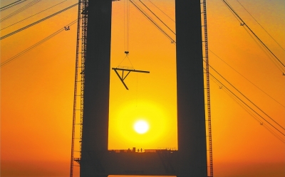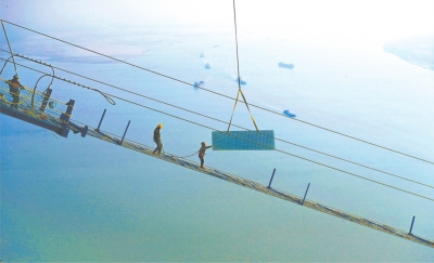 | 2024年11月21日,大桥建设者在双柳长江大桥铺设猫道。为防止建筑材料掉进长江污染江水,施工人员在猫道上铺设了密实的钢网。 |