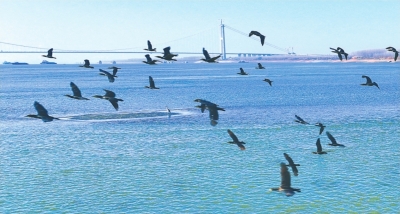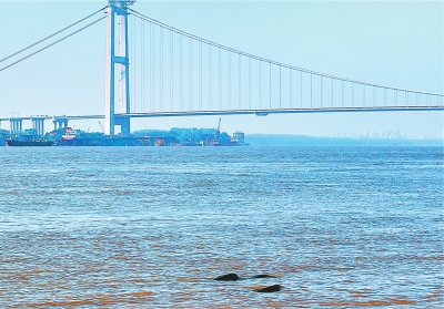 桥上车轮滚滚,桥下一侧的“江豚湾”水域,几头长江江豚逐浪嬉戏,成群候鸟觅食栖息。