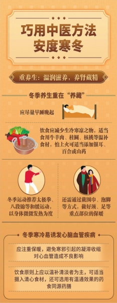 保养攻略:冬天,有心脑血管基础疾病的人要特别注意防寒保暖,出门戴围巾和帽子,从室外进屋别马上脱外套,给血管适应时间;要多喝水,降低血液黏稠度,多吃富含纤维素的食物,保持大便通畅;室温控制在20℃左右,避免室内外温差太大;保持心态平和,避免情绪激动;有高血压、冠心病、动脉硬化等原发基础疾病的人群,冬季更需按时服药,不可自行减量或停药。