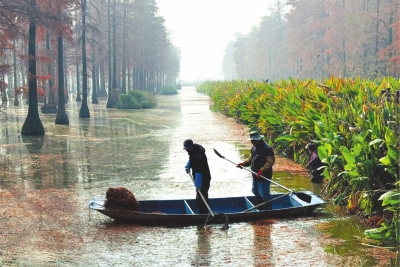 近年来,随着网络热度的持续攀升,涨渡湖公园吸引了越来越多的摄影爱好者和游客。18日,记者驱车从江北快速路、347国道至刘大路,再沿主港路前行。漫步于木质栈道,火红的池杉林尽收眼底。不远处,两名工作人员正驾船打捞飘落的池杉叶。区林科所工作人员朱春菊介绍,冬季的池杉尤为迷人,火红的树叶犹如晚霞般绚丽,但飘落的树叶要及时清理。