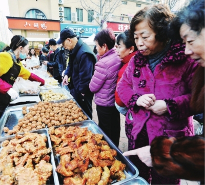 | 现场炸制的肉圆子、鱼块和卤菜等食品广受居民欢迎。 |