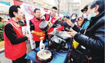 “陈师傅黄陂圆子”现炸展位,金黄酥脆的肉圆子、外焦里嫩的鱼块、藕香浓郁的藕夹在油锅中翻腾,浓郁的香气弥漫整个广场。“这香味太正宗了!一下子就把过年的感觉带回来了。”居民刘大爷带着小孙子在展位前排队等候,他感慨道,“现在家里很少开这么大油锅炸年货了,能在社区里看到、买到现炸年货,感觉特别亲切,这才是我们武汉人过年的仪式感。”许多居民闻香而来,一边品尝着热乎圆子,一边交流厨艺。摊主陈师傅忙得额头冒汗,脸上却满是笑容:“看到大家这么喜欢,再累也值得!能让街坊邻居方便地买到放心、地道的黄陂圆子,我也算为社区年味出了份力。”