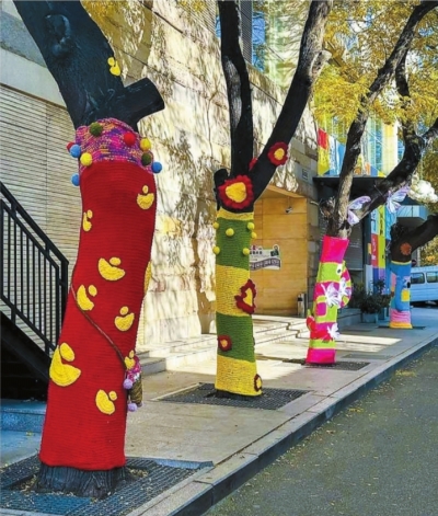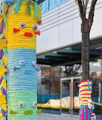 近日,全国多地街头的树木穿上了“彩色毛衣”,这些“毛衣”上有的是可爱的卡通图案,有的是搞怪的表情,吸引了不少市民驻足拍照。