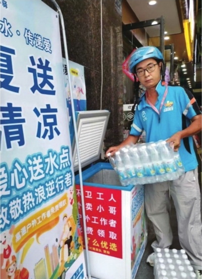 | 赵承军带队员筹集了爱心送水点。 记者史强 摄 |