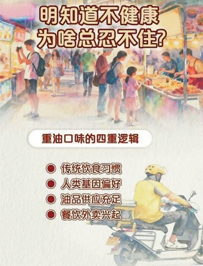 清晨,油饼、油条散发着诱人的油脂香气;午餐时分,红烧肉、麻辣香锅、油炸鸡米花占据外卖平台热销榜单;深夜,小吃摊吸引人们大快朵颐……这是当代都市人饮食生活的常见场景。随之而来的,是健康状况亮起“红灯”。