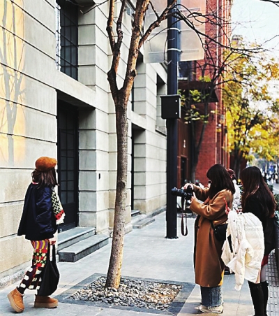 青岛路上,树的光影映照在老建筑上,成为很好的背景。