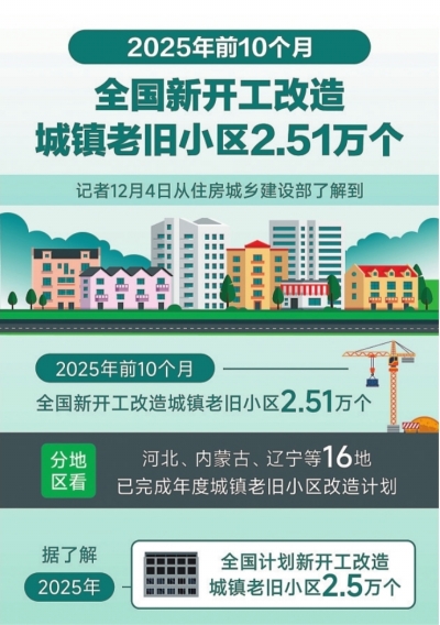 2025年,城市更新取得重要进展。一大批城市更新项目落地实施。我国完成106个完整社区试点,建设改造养老、托育等各类服务设施2000多个,新增停车位2.6万个,增补提升公共活动场地和公共绿地71.3万平方米。