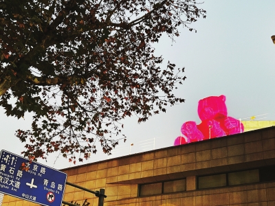 武汉美术馆的粉红熊雕塑。