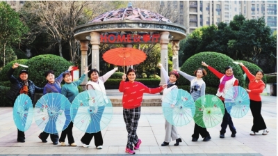 | 在金域蓝湾社区,由居民组成的好姐妹艺术团在HOME议事厅前排练舞蹈。 |
