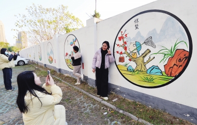 | 新华社区的居民在二十四节气彩绘墙前打卡拍照。 |