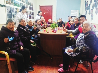 | 龙灯社区“来滴红先锋志愿服务队”陪伴老人们玩折纸游戏。 |