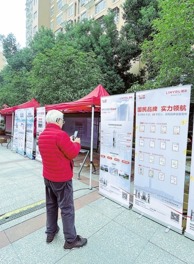 | 居民陈师傅在宣传展板前了解电梯更新政策。 |