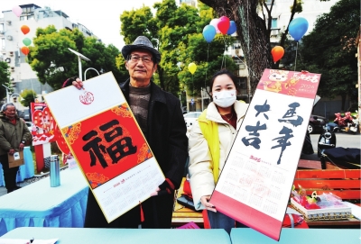 另一侧的书法作品区墨香弥漫。70岁的书法老师吴兆敏专注地为居民书写新年挂历并进行义卖,“福”字气韵生动,“马年大吉”“一马当先”等吉祥语句跃然纸上,精湛技艺吸引众人驻足。