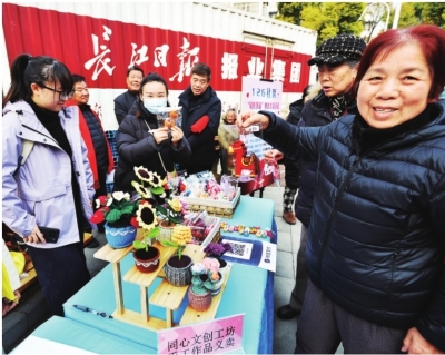 慈善义卖区围满了居民。在钢都花园街道社工站博雅社工协助设立的摊位前,126社区创意手工坊志愿者们亲手编织的包包、挂件、中国结等手工艺品整齐摆放。“这些作品针脚细密,藏着不少巧思,我挑了这个中国结挂件,既有年味又能献爱心。”居民李琴玉拿着刚买的手工艺品,笑意盈盈。