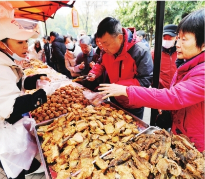 | 现场炸制的肉圆子、鱼块等食品走俏。 |