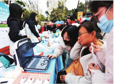便民服务市集区域,各摊位前排起长队。钢都花园社区卫生服务中心的全科义诊点前,医生正耐心为居民检查。“阿姨,您的骨密度检测显示中度骨质疏松,建议口服补钙、多晒太阳、适当运动。”全科医生汪文细致解释后,还特意将建议写在纸上。七旬居民柯汉香称赞:“医生讲得清楚,服务真周到!”