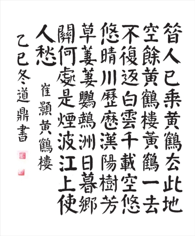 | 《黄鹤楼》 唐·崔颢 作者:曹道鼎 (68岁) 释文:昔人已乘黄鹤去,此地空余黄鹤楼。黄鹤一去不复返,白云千载空悠悠。晴川历历汉阳树,芳草萋萋鹦鹉洲。日暮乡关何处是,烟波江上使人愁。 点评:这幅中楷尺牍,运笔沉着,点画遒劲,干净整齐,深得颜真卿端庄正大气象。 |