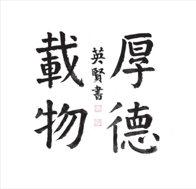 | 《厚德载物》 作者:王英贤(70岁) 点评:厚德载物四个大字,章法独特,在四字中间题款甚为少见;用笔垂露、掠撇、钩趯之异,守之八法,其字法与笔法相得益彰。 |