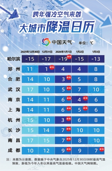 2025年12月30日起至2026年1月2日,一股实力强劲的跨年冷空气将先后影响我国中东部大部地区。