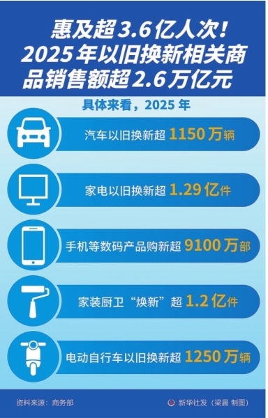 据新华社电 记者近日从国家发展改革委获悉,为优化实施“两新”政策,做好政策平稳有序衔接,满足元旦、春节等旺季消费需求,近日,国家发展改革委会同财政部,已向地方提前下达2026年第一批625亿元超长期特别国债支持消费品以旧换新资金计划。