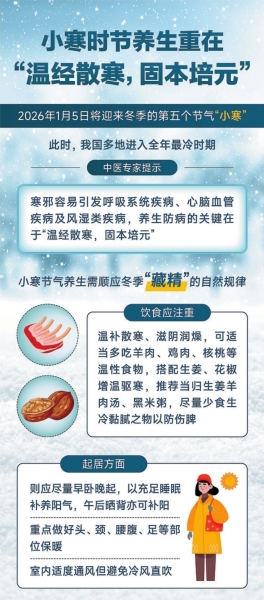 1月5日,我们迎来了小寒节气。《月令七十二候集解》里说:“十二月节,月初寒尚小,故云。月半则大矣。”虽未到最冷时节,但已进入“二九”后期。中医专家提示,寒邪容易引发呼吸系统疾病、心脑血管疾病及风湿类疾病,养生防病的关键在于“温经散寒,固本培元”。