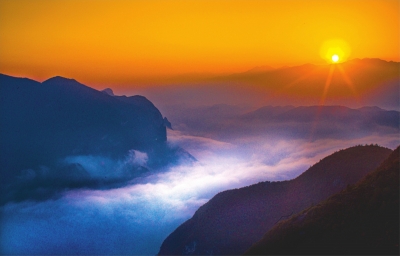 | 《晨晖山海》 作者:刘时俊(63岁) 点评:这张作品的色彩运用堪称点睛之笔,暖调的橙黄霞光与冷调的蓝青云海形成强烈冷暖对比,既突出了朝阳的炽热,又渲染出云海的静谧,色彩过渡自然且层次丰富,让画面视觉冲击力十足。 |