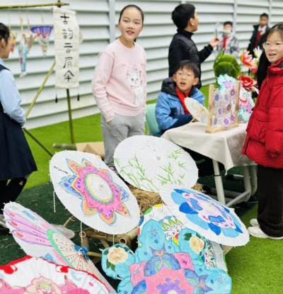| 孩子们与他们亲手制作的古韵云肩伞。 |
