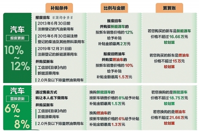 这个比例又因报废、置换新能源车或燃油车而不同。具体是,对于符合条件的汽车,报废后购买新能源车可按新车价格的12%计算补贴,购买2.0排量以下燃油车补贴按新车价的10%计算;置换车则比例更低,分别是8%和6%。