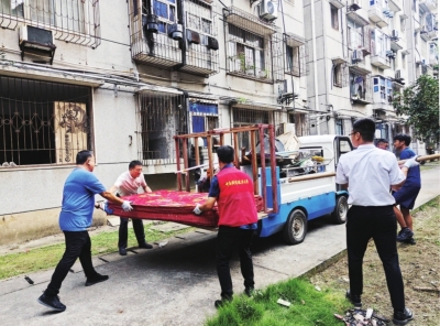 | 齐心协力清理楼道堆积的杂物。 |